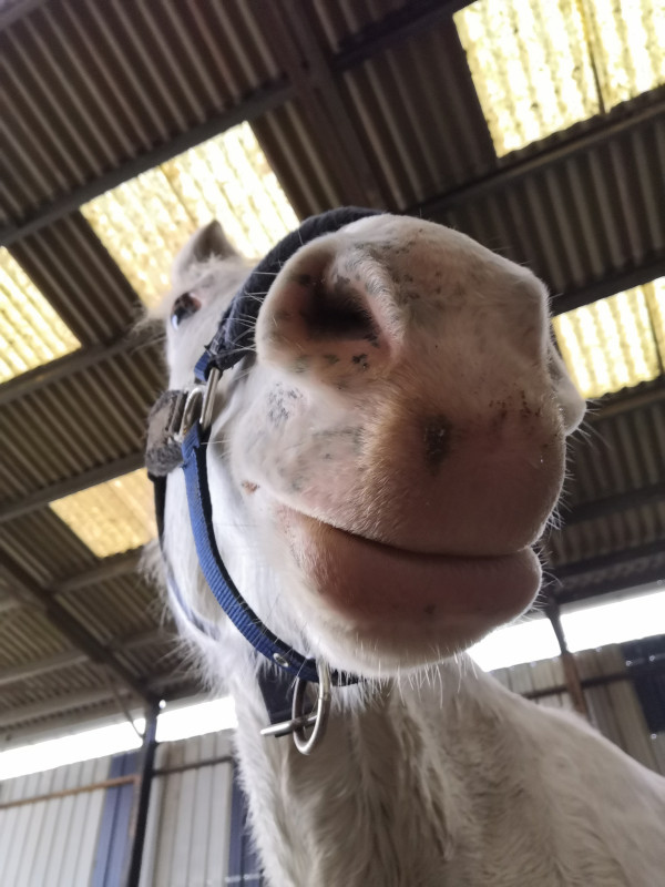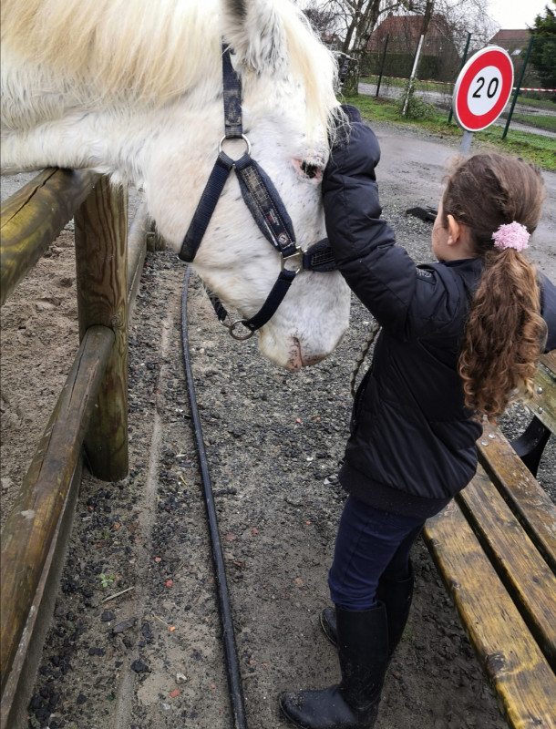 A la sortie du van, plutôt sur l'oeil, elle ronfle beaucoup. On l'a mise 1h30 dans un boxe (le gérant devait s'absenter) avant de la mettre en pâture avec 4 autres chevaux. Personne ne s'est calculé ahah, tout s'est très bien passé entre eux. L'après-midi j'y suis retournée, avec un autre cheval ils se grattaient l'encolure.