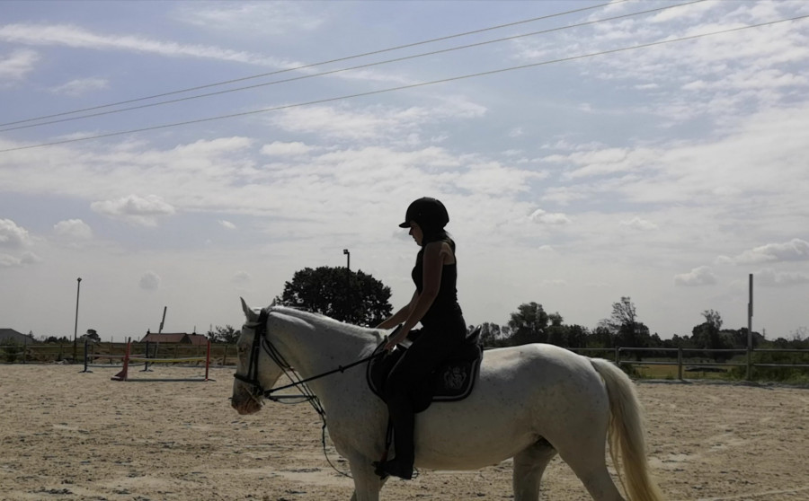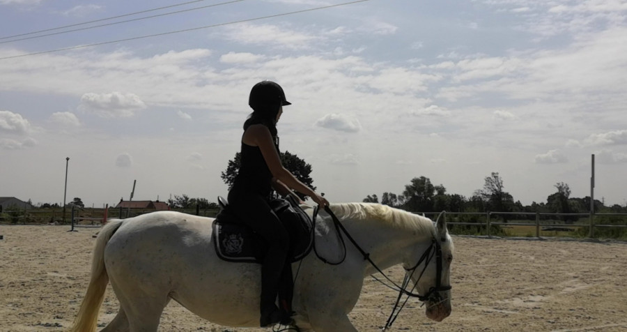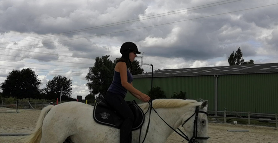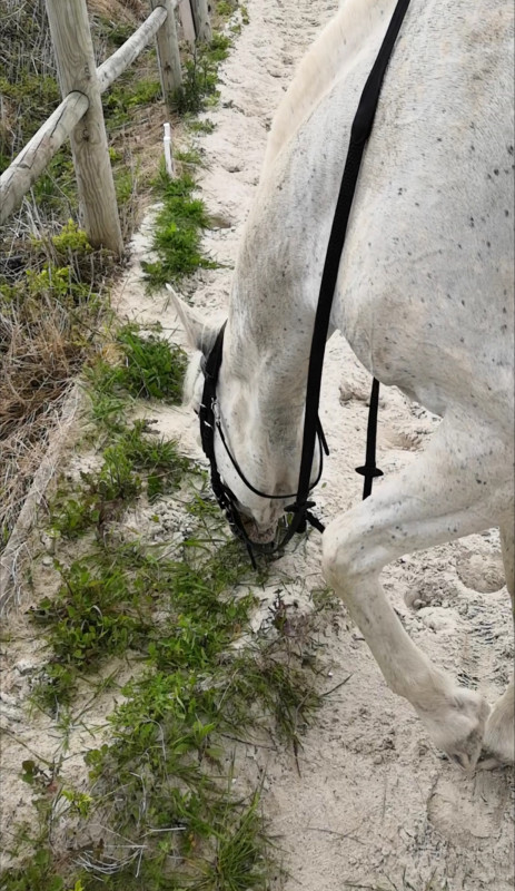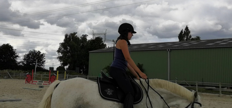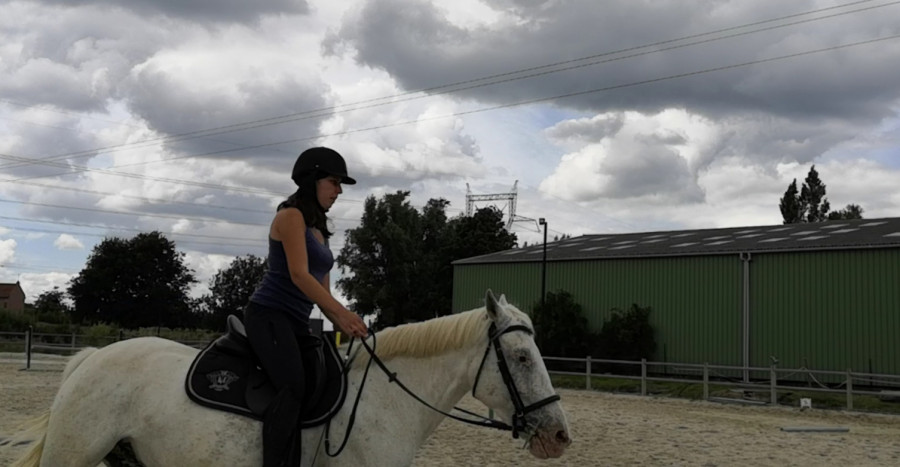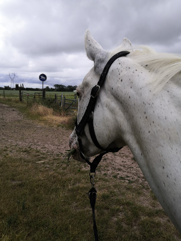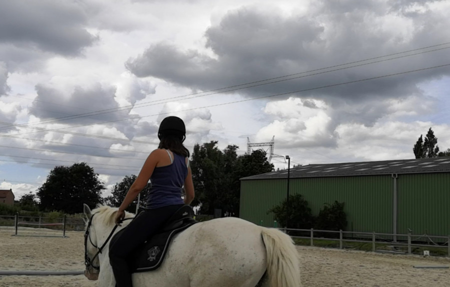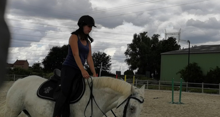 Là j'ai repris dans le calme, rênes longues, au pas. Elle se traversait un peu sur les longueurs au départ, mais en grattant avec ma jambe et en félicitant quand c'était bien elle restait droite sur la piste. Elle est restée tranquillement au pas, tête basse, je sentais ses hanches bien bouger. Avant c'était un tour de carriere au pas puis elle trottinait tête en l'air et je la perdais... Là on a pu marcher longuement.
