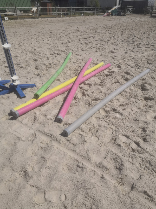 Ensuite j'ai mis quelques barres n'importe comment car elle a tendance à ne pas regarder ses pieds et donc à trébucher. On les a passé dans tous les sens, et elle faisait bien attention. On franchissait aussi une petite croix au pas, et deux barres au sol éloignées d'à peine une foulée de pas en V.