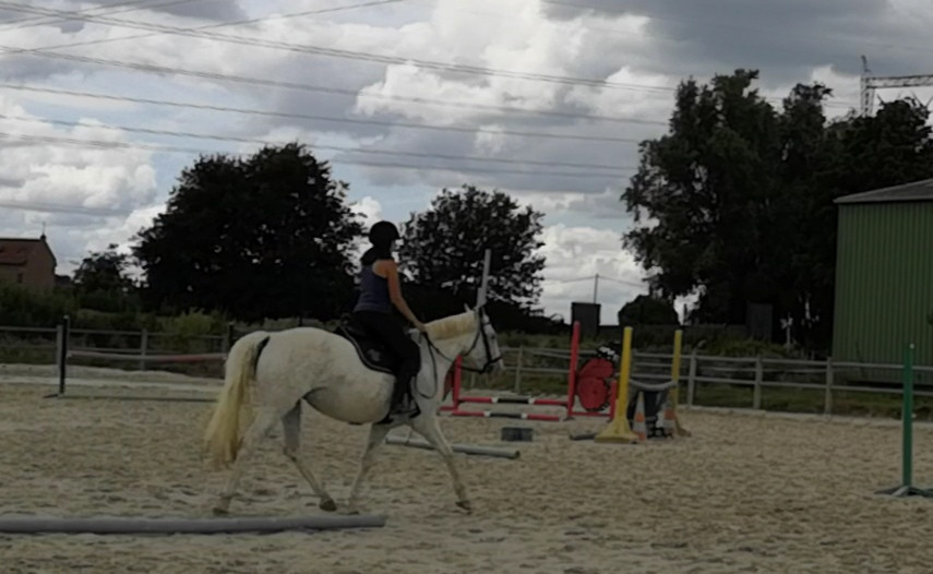Puis on a pris le trot, un bon trot correct, avec une bonne attitude et une bonne cadence. Un peu raide au départ à main gauche, donc j'ai travaillé sur des courbes larges, serpentine, cercles (youhou elle a réussi à tenir ses cercles au trot !!!), demi-volte, demi-volte renversée. Petit à petit elle se tenait mieux dans ses tournants. Et on avait une difficulté auparavant dans un coin, où elle s'échappait et se contre-incurvait complètement ; aujourd'hui parfait, j'ai juste du faire 2 voltes pour lui rappeler que non, on va dans le coin, et ensuite pas de rappel à l'ordre ! Et tout cela rênes mi-longues. J'y touchais juste pour la redresser de temps en temps.