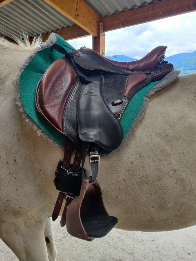 C'est une selle Randol's Luberon, le siège en lui-même a une forme assez classique mais je ne peux pas y attacher un dessus de selle classique à cause de la forme du reste de la selle.