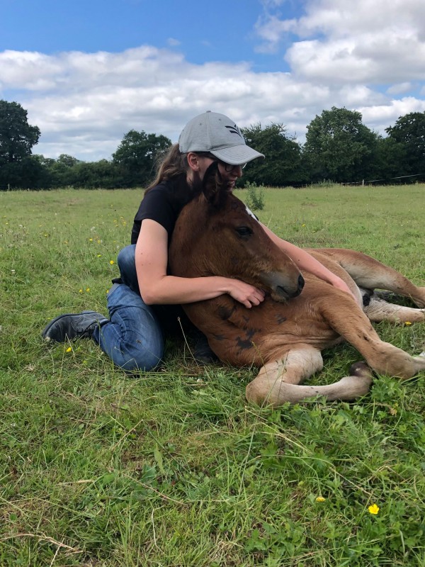 Toutefois, comme je vous l'ai dis par deux fois, petit loup est au box avec ces sorties minutés mais entre deux il y a une fois où petit loup était en pâture avec une résine sur le sabot et son gros pansement derrière. L’éleveuse n'était pas là quand je suis arrivé mais elle m'avait dit par message que bébé adorait qu'on lui gratte le ventre quand il était allongé or quand j'arrive, c'est l'heure de la sieste chez les poulains ! Et petit loulou est allongé en vache. Il me regarde, et je me dis, allez tente. Je m'approche doucement il me laisse mais me regarde en coin, finalement j'arrive à côté de lui et le prend dans mes bras. Moment magique. Il finit même par "se poser" sur moi et j'suis littéralement la fille la plus heureuse au monde.