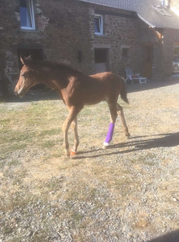 Monsieur était tombé en clinique lors des radios de contrôle et s'était ouvert le postérieur. Je m'imaginais déjà une balafre qu'il allait garder à vie sur sa belle balzane blanche en me demandant pourquoi le monde était si injuste. Il s'avère que ce qu'il avait c'était trois fois rien mais l’éleveuse avait fait un gros pansement pour éviter d'avoir une tension inégale sur le tendon ! Et même si elle m'avait dit: Non mais je vous assure c'est une toute petite balafre dans ma tête quand j'ai vu le pansement je me suis dit que c'était fini mon petit poney avait à peine 3 mois et il était déjà tout cassé de partout