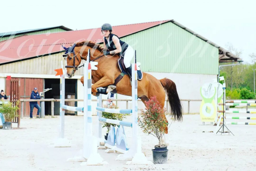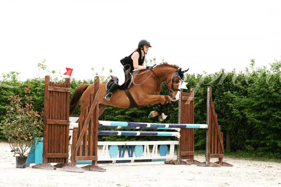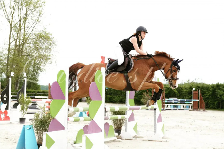 On part sur le numéro 1 en sous régime mais ça passe, le 2 est placé le long de la ligne du jury donc je rééquilibre et je tiens tout ce que je peux ( bien trop mais bon ) on arrive dans le pied mais il le saute vraiment bien, on repart ligne courbe pour aller sur le 3 un oxer en descente qu'il passe sans problème. Je le repasse au trot pour changer de pied et on se dirige vers la ligne verticale-oxer en montée, tout va bien jusque là.