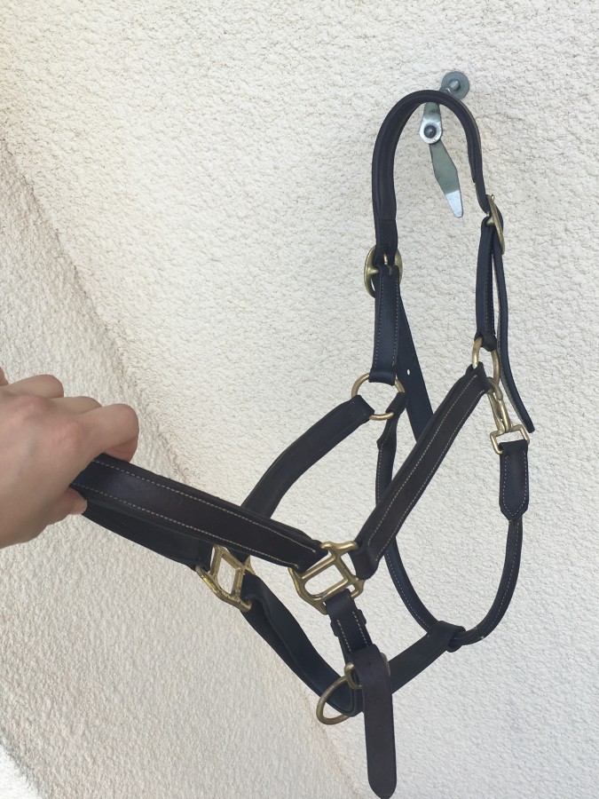 -licol en cuire havane, taille cheval, bon état, 25 euros.