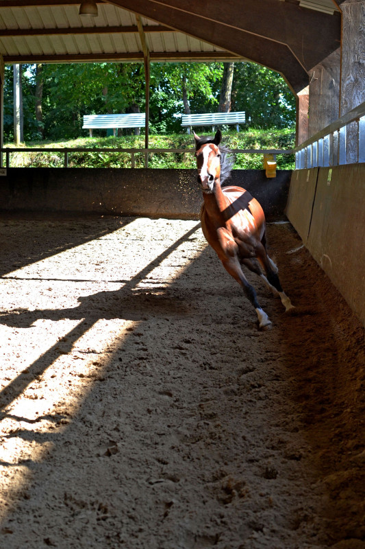Pour Pharell, choses simples au programme : variations dans l'allure et dans l'attitude, développer reprendre, le descendre sans qu'il ne s'enferme. Pas mal d'assouplissements pour qu'il vienne pousser ses jolies petites fesses et développer la propulsion : épaules en dedans, têtes au mur. Quelques cessions à la jambes. J'ai terminé sur des trot-galop-trot sur le cercle en lui demandant de se tenir. Adorable ado.