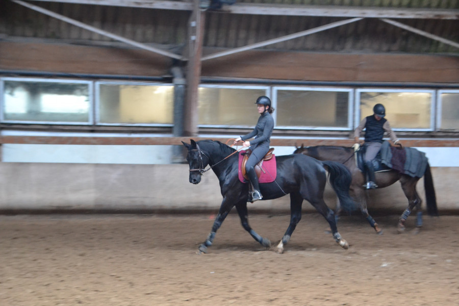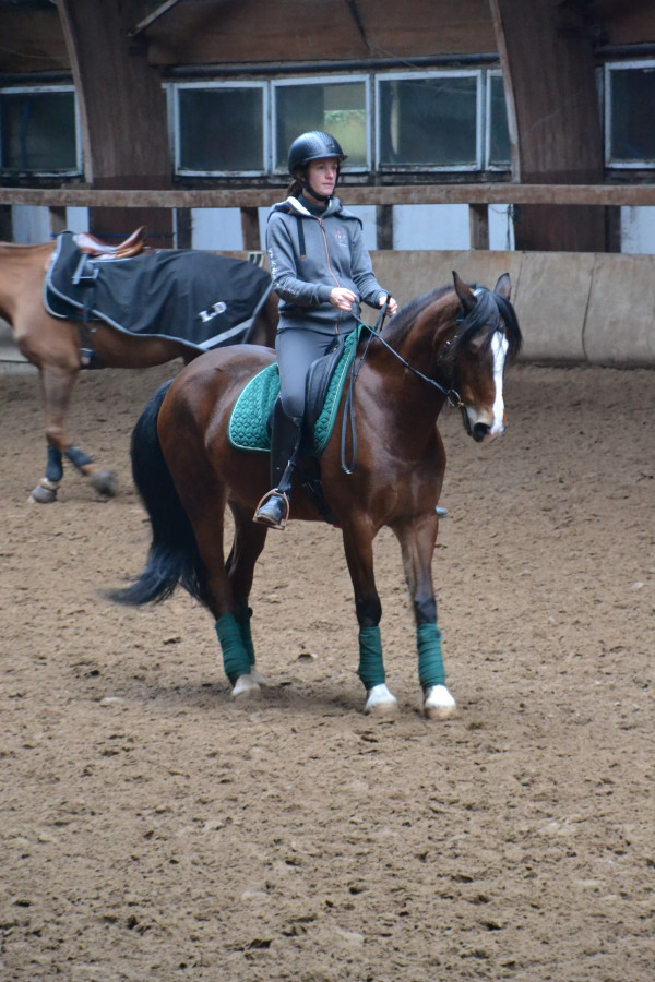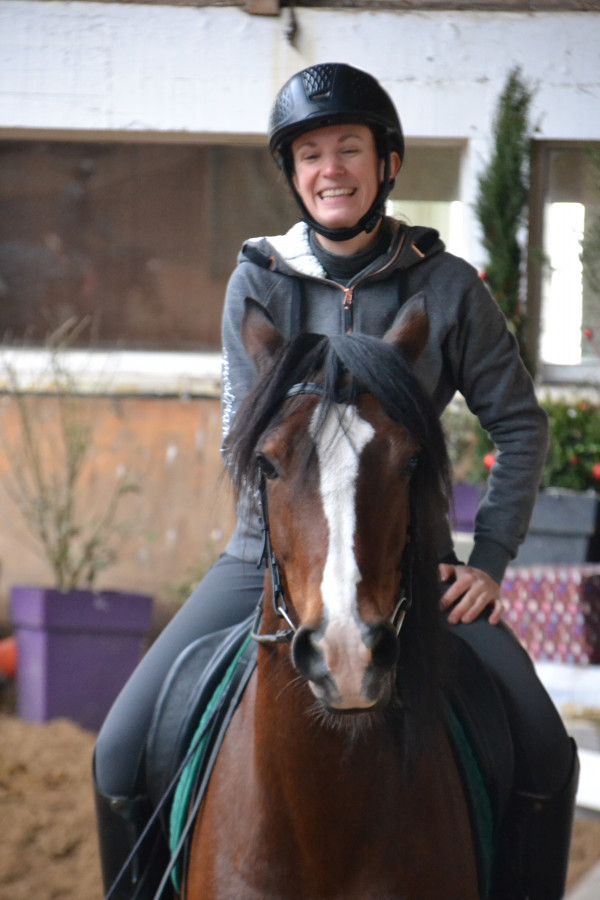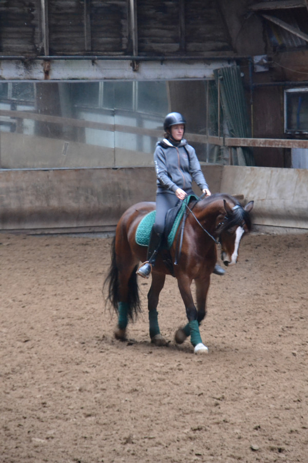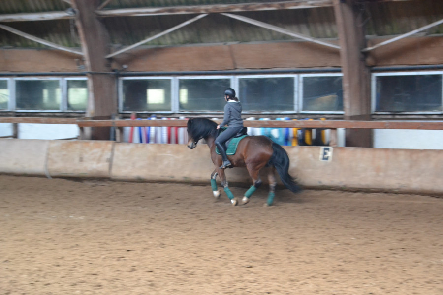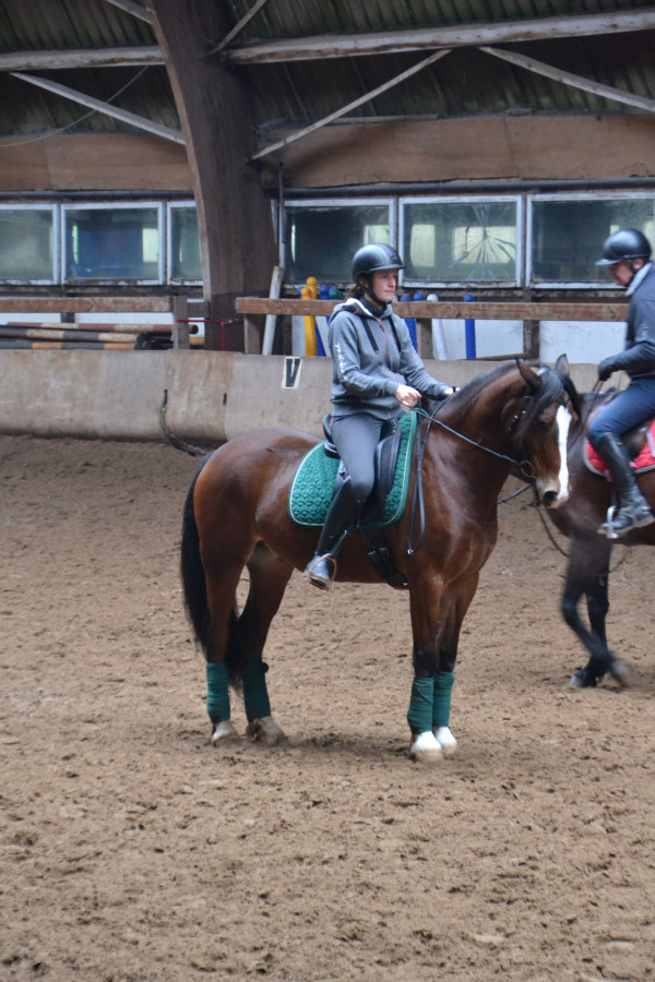 James, adorable amour. Séance courte avec des transitions, un peu les mêmes enchaînements que le grand frère en plus complexe et plus rapide. Bon poney. J'ai terminé en ramassant un cheval qui avait éjecté sa cavalière en cours. Oups.