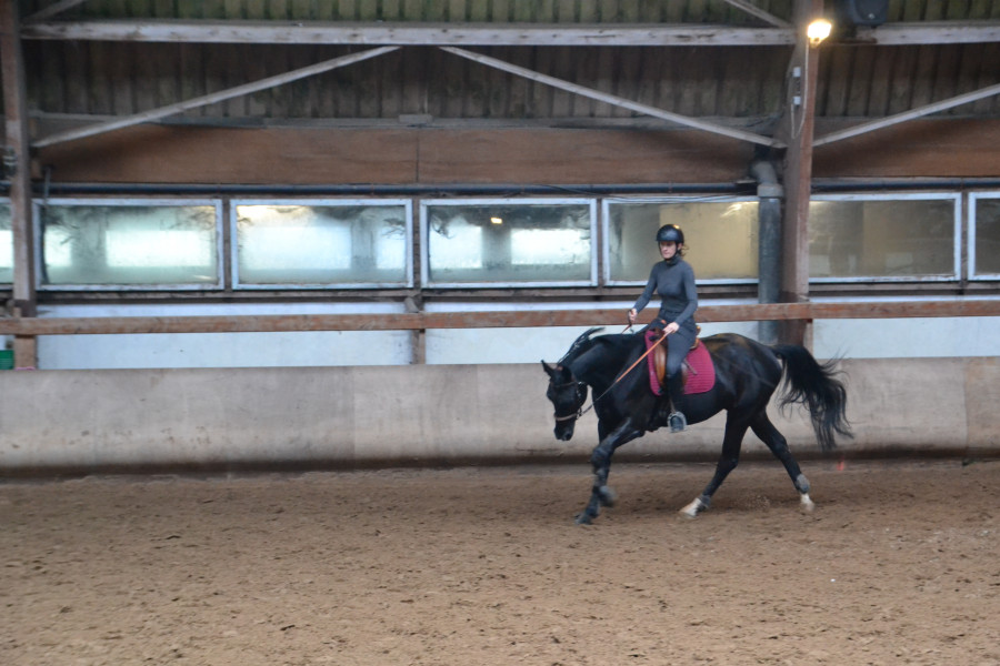 Pharell, le manège était le lieu de tous les dangers : entretien de l'éclairage avec des gens qui se baladent à pied avec du matériel, des échelles de 10m, etc. Il regardait avec l'air coquin mais rien à déplorer. Il a bien travaillé, petite embardée encore mais mignon. J'ai pu profiter du manège entier pour travailler les départs au galop en ligne droite.