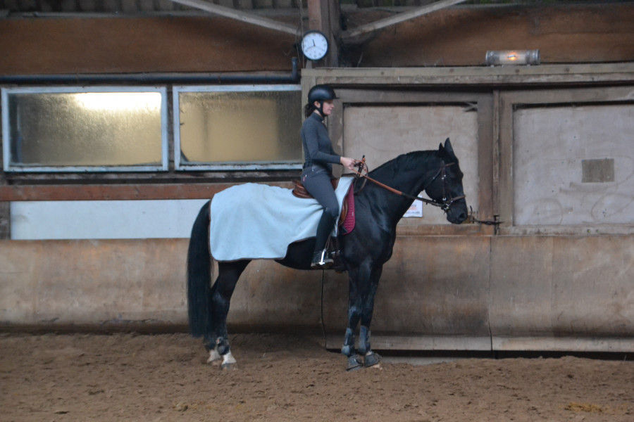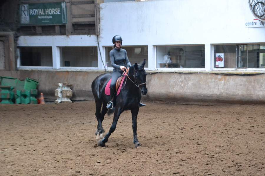 Puis James, le mec était plutôt dispo mais pas très tendu (oubli d'éperons d'ailleurs). J'ai fait de la transition complexe à foison. Un peu de développement au trot et au galop, un peu d'appuyer. Praf.