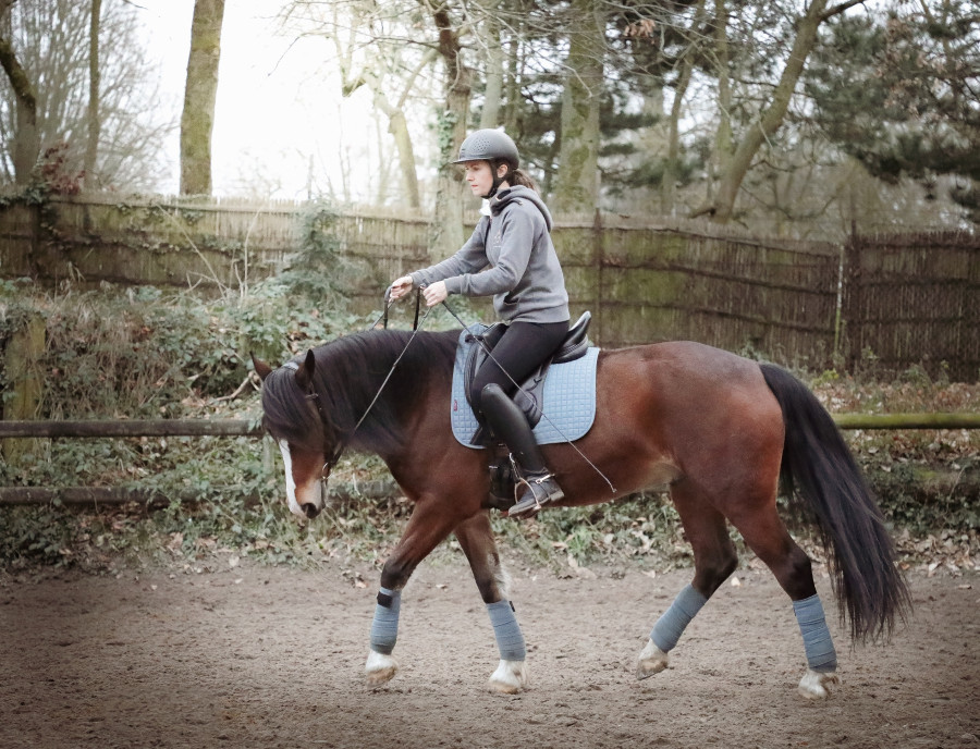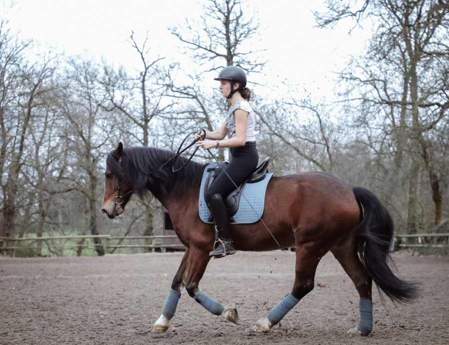 Hier petite séance de plat. Ambiance transitions intra allures. Globalement aux trois allures : réduire le cercle, ralentir la cadence, développer, partir en ligne droite, recommencer. Pas si facile mais objectif poney explosif qui répond à l'assiette sans besoin de jambes.