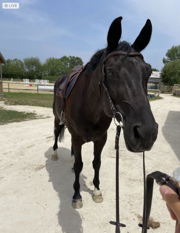 Jeudi, cours pour le grand bêta. On ne l'a pas explosé, il faisait déjà chaud. J'ai travaillé à l'avoir dans un galop propulsé dès la détente. Un peu de contre galop (il est désormais vraiment mieux à droite lol). Puis du travail au trot, encore et toujours perfectionner les incurvations, et travailler à la descente de mains et jambes. J'essaye j'essaye !