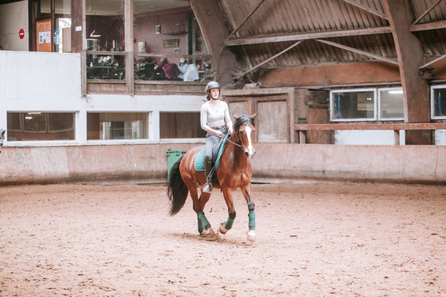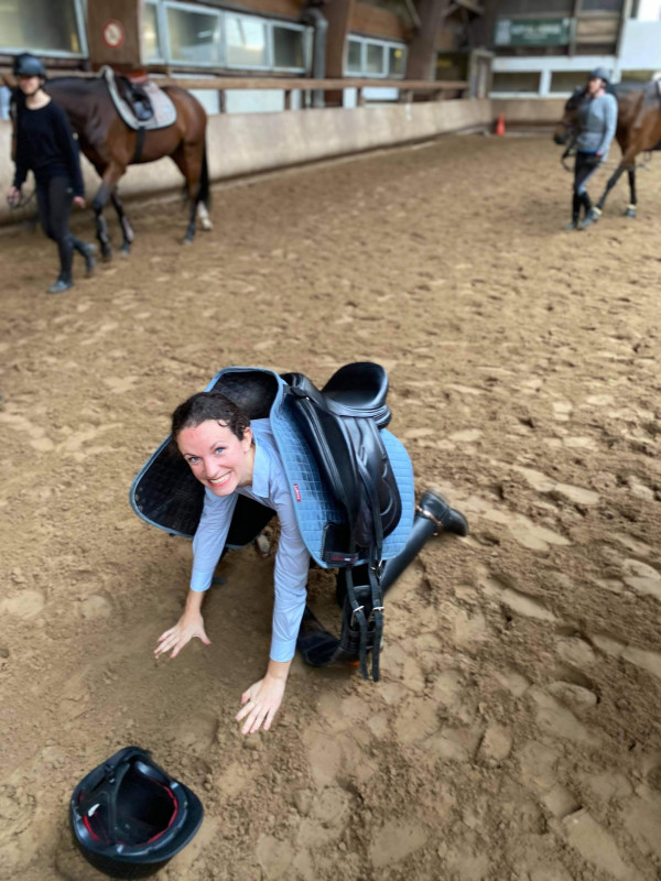 Le nain, stage de dress bis. Encore du galop ! Des épaules et contre épaules en avant, pas si mal, ce qui est chouette vues nos difficultés sur cet exercice à cette allure. Du cercle, du contre galop, de la transition galop-pas. Bon gars, bien bossé.