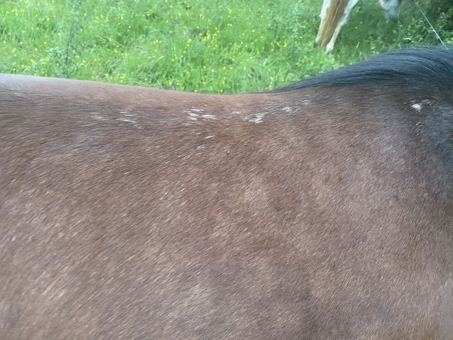 Sauf que le temps du confinement (je ne l’ai pas montée à cette période) elle a des poils blancs qui sont apparus le long de la colonne. (Là ou la selle n’est pas censée appuyer )