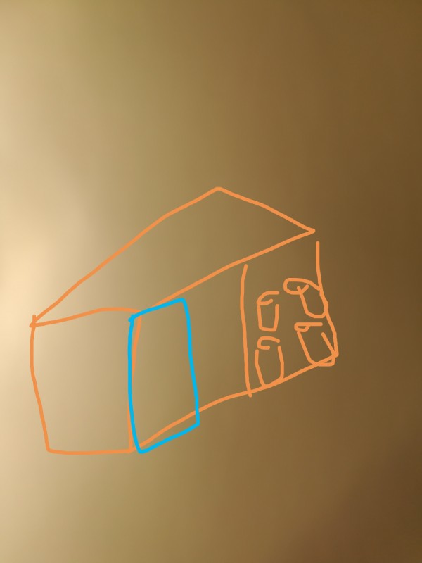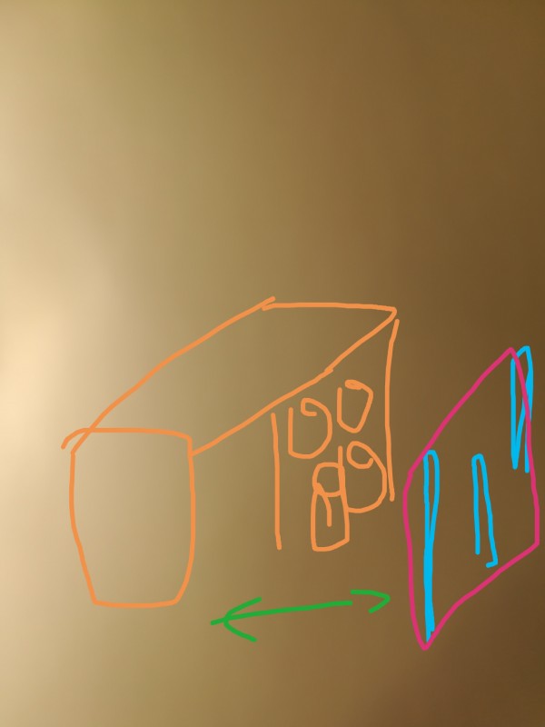 Pardon pour mes schémas de piètre qualité, je dessine au doigt sur mon téléphone ^^. Donc en premier, la bâche est représentée en bleu avec des cordons tendus sur des piquets. En deuxième, en rose, tendue directement sur des piquets en face de l'entrée de l'abri. La flèche verte représente un espace à laisser entre l'abri et la bâche (3 mètres je dirais pour que ce soit plus sécure, encore que, si vraiment il y a bagarre ou bousculade, la bâche cassera, aucun cheval ne devrait réellement se coincer ). Et donc en troisième bâche ou bois en bleu contre une partie de l'entrée.