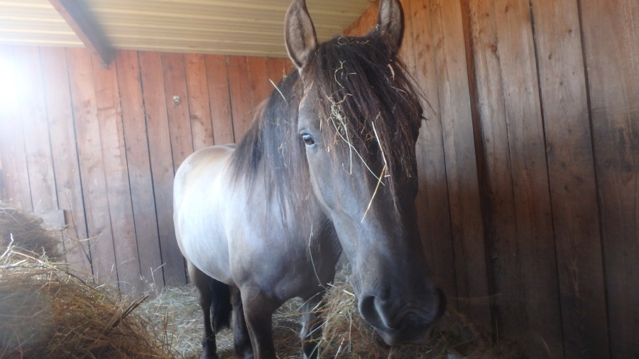 Du coup je l'ai ramené dans mon écurie, il vit au boxe avec sortie au paddock tous les jours pendant 3 heures, à côté des copains mais pas dans le même paddock. Il est désormais nourri aux céréales concentrées et ferré devant avec des fers en plastique.