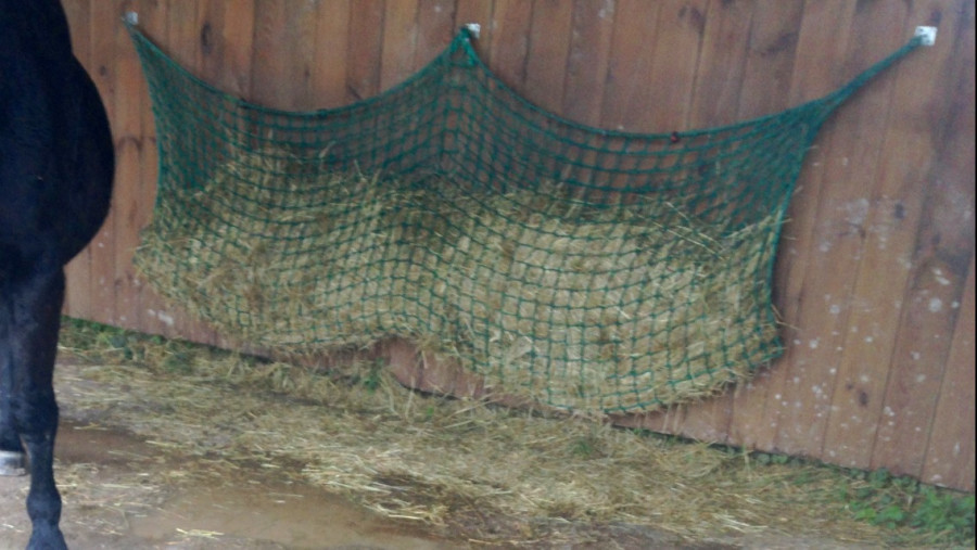 Mes 2 chevaux ont un abri, dans lequel je suspend actuellement 2 filets à foin matin et soir. Je fais comme ça depuis 4 ans mais ça commence vraiment à devenir lourd et pénible. Déjà c'est long, ça demande de remplir les filets matin et soir, et d'en préparer plein à l'avance quand je m'absente. J'ai beau les blinder (et je n'ai jamais pesé mais c'est lourd!), ils finissent en quelques heures et restent ensuite plusieurs heures à attendre le prochain repas. Et puis idem, hisser les filets sur les anneaux dans l'abri me flingue le dos.