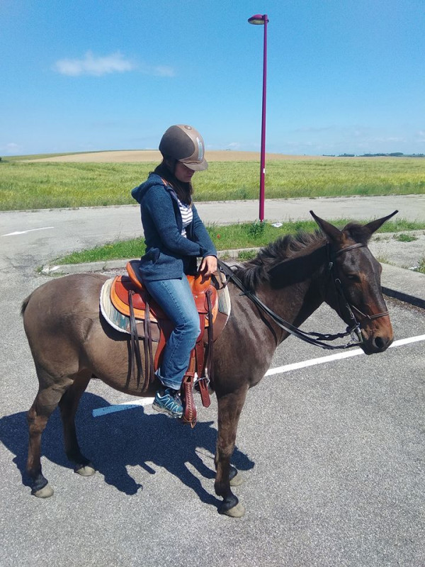 puis une amie est venue me le monter et m'accompagner avec ma jument queqlques fois seulement mais il a bien aimé, puis une 2e 2 fois et là j'ai trouvé une dp pour venir le monter en balade avec moi ma jument, ma fille son mini mulet et la dp et mon mulet