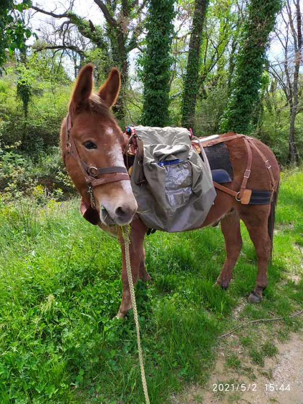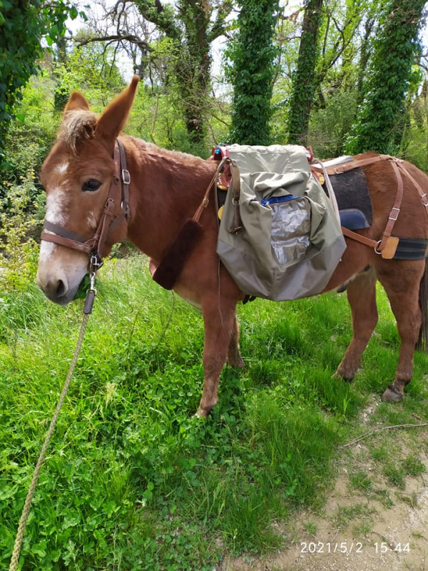 Il marche a ma botte, comme quand je suis a cheval, une bonne foulée régulière récompensée par des pauses broutage! Il commence a mieux accepter que je secoue le bât quand il marche, il se contente de me regarder faire alors qu'avant il s'écartait apeuré.