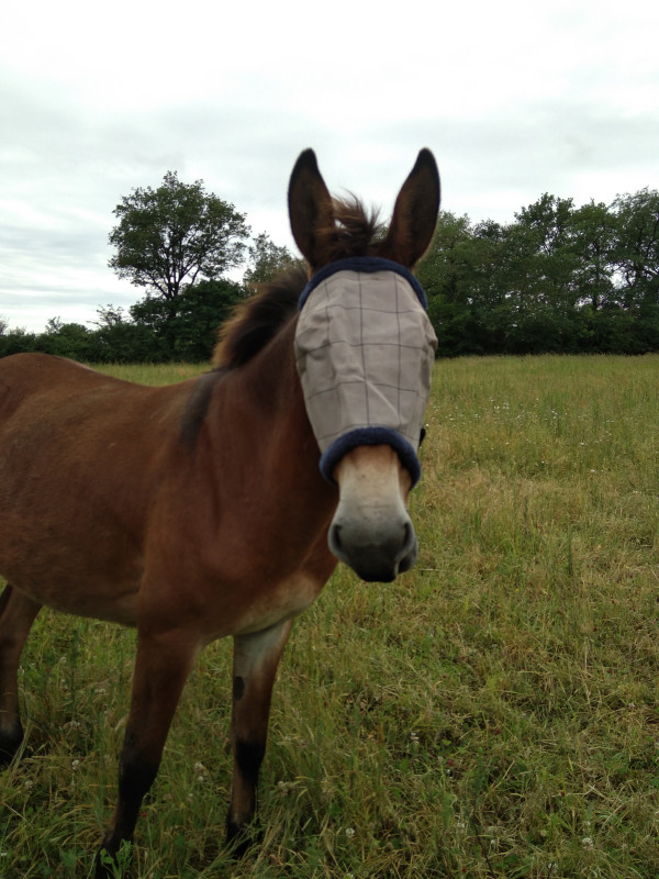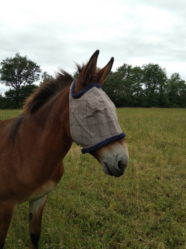 Ici aujourd'hui c'était découverte du masque (je suis pas trop a en mettre mais là ils avaient les yeux irrités par les mouches depuis 2 jours) bref 20 min de négociation et de mots doux pour qu'il me laisse lui mettre. Et puis finalement après il avait l'air très content avec !!
