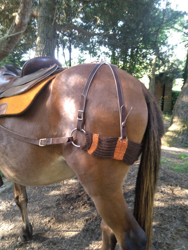 pour mon âne j'avais fait l'avaloir relié à l'arrière de la selle et à la sangle, plus stable. Pareil pour mon ardennais. Joli travail en tt cas !