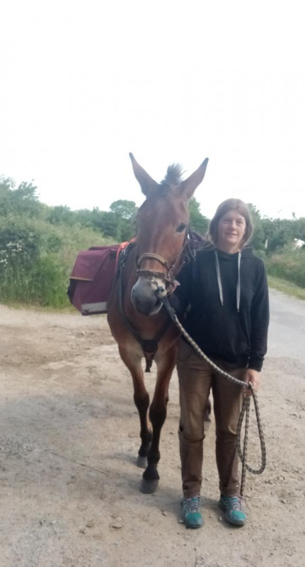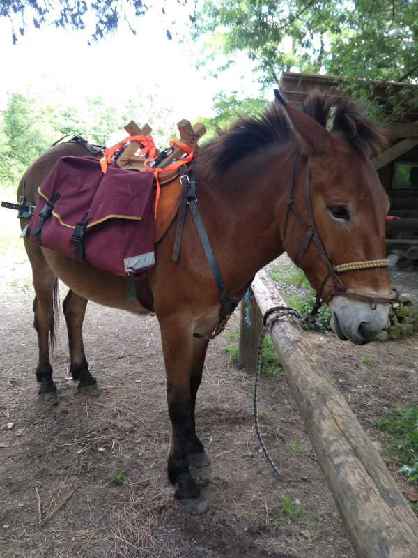 Ici aujourd'hui j'ai bâté le mulet , chargé les sacoches de tous nos verres (bières principalement !!) Et en route jusqu'au container de tri situé à 3km5. Ça fait un trajet zéro carbone et éducatif pour le mulet qui a croisé VTT, marcheurs, tracteur, chevaux et la traversée d'un gué . Et 1h de marche pour moi. J'avais mis le caveçon en plus du licol pour le passage de la route (1km en tout) où passe souvent des tracteurs. Mais au licol le reste du temps