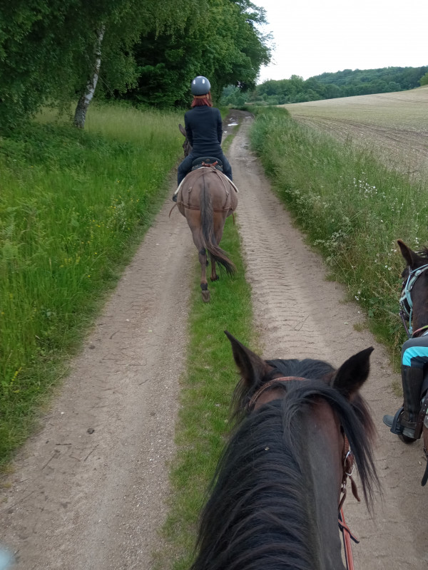 J'ai ensuite fait une balade avec Gimli, à la fraîche c'est très agréable. On a fait les 3 allures , il est maintenant geniallissime quand on sort seul. Il adore marché, trotté aussi mais pas trop longtemps et le galop il part à la voix mais faut le solliciter et 100 mètres grand max c'est bien mais ce n'est pas l'allure qu'il préfère. Ça me va très bien, si je veux me taper un bon galop j'ai les chevaux.