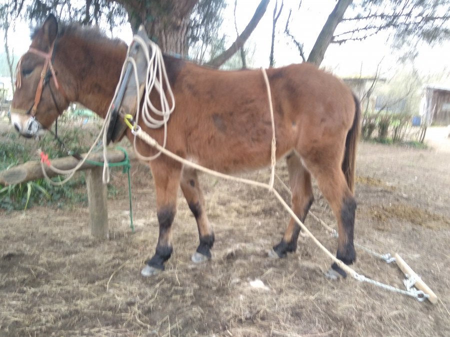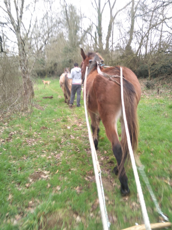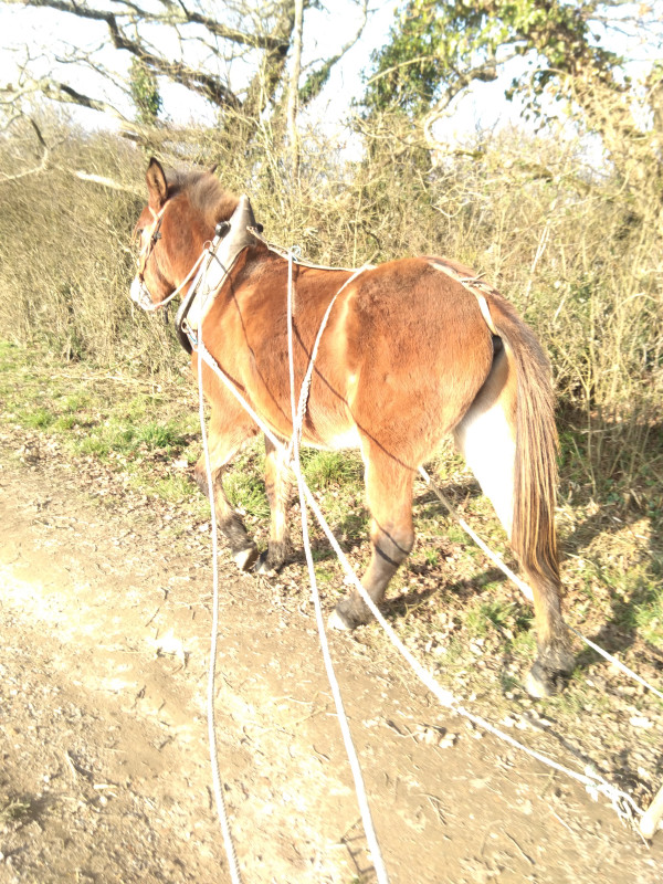 Aujourd'hui après avoir vu un mulet en traction sur fb, je me suis remise au travail traction avec Gimli. Je lui ai mis le collier, le surdos , les guides et pour la première fois le palonnier et les traits. Il a géré !! Il m'a fait confiance : il regardait derrière lui,, marchait un peu en crabe pour voir ce qui trainait derrière et puis c'était ok et acquis. On a fait le tour de la ferme . Objectif: l'utiliser sur la ferme comme on utilise nos 3 traits. Hersage, transport, maraîchage et broyage. Bon on aura surement beaucoup de travail pour y arriver mais on est pas pressé on a tout notre temps.