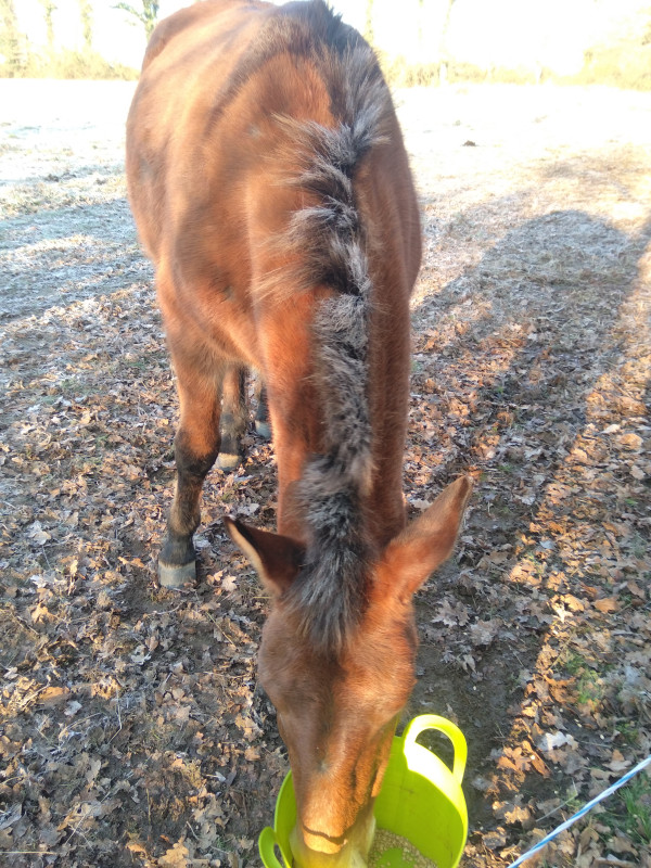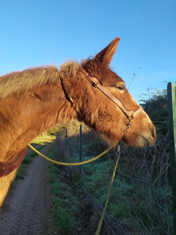 En ce moment il fait beau mais froid alors le matin le mulet a le crin givré!
