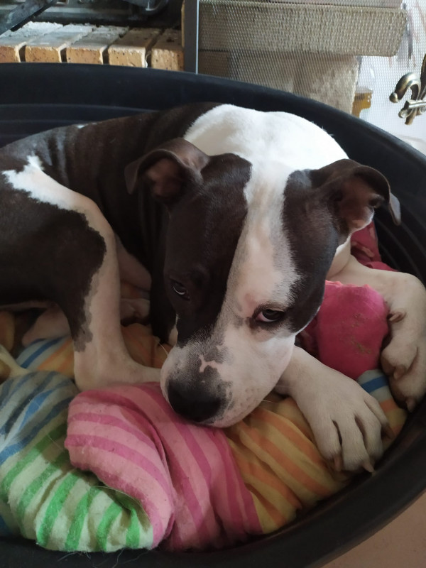 La chienne est une chienne saisie des squats avec un passé difficile que l'on on essaie de lui faire oublier mais ce n'est pas toujours facile avec les autres animaux de la maison.