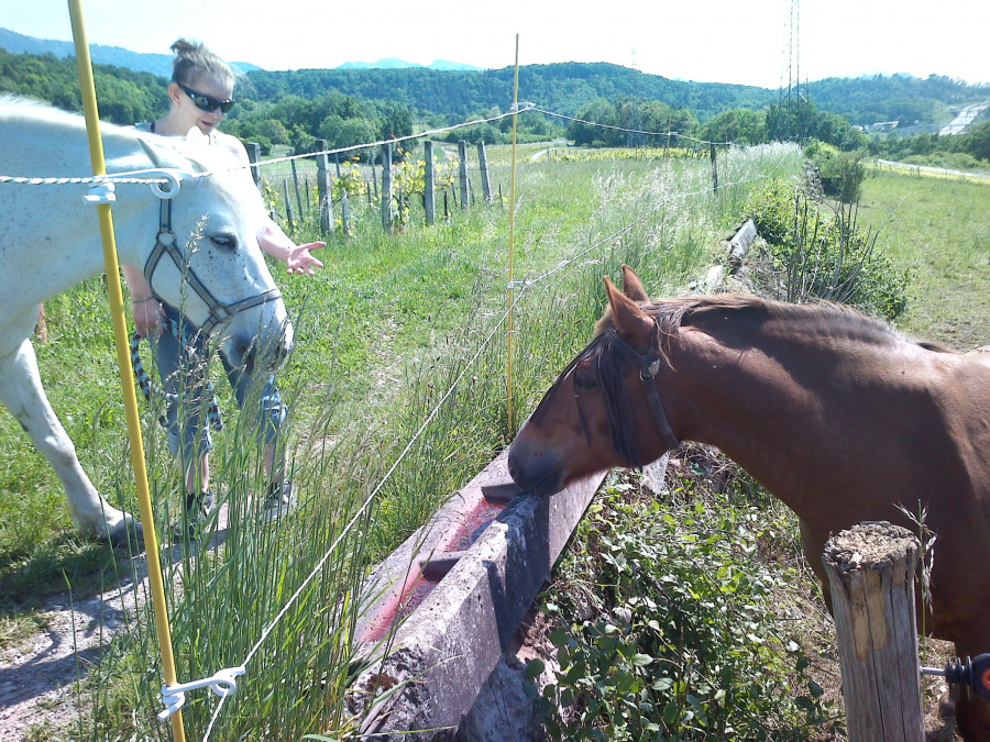 Puis une dame avec une camarguaise ,qui a excité un peu la curiosité de Mia ...La dame a fini par dire que ça arrive parfois quand ils sont castré tard (je lui ai fait remarquer que c'etait une jument
