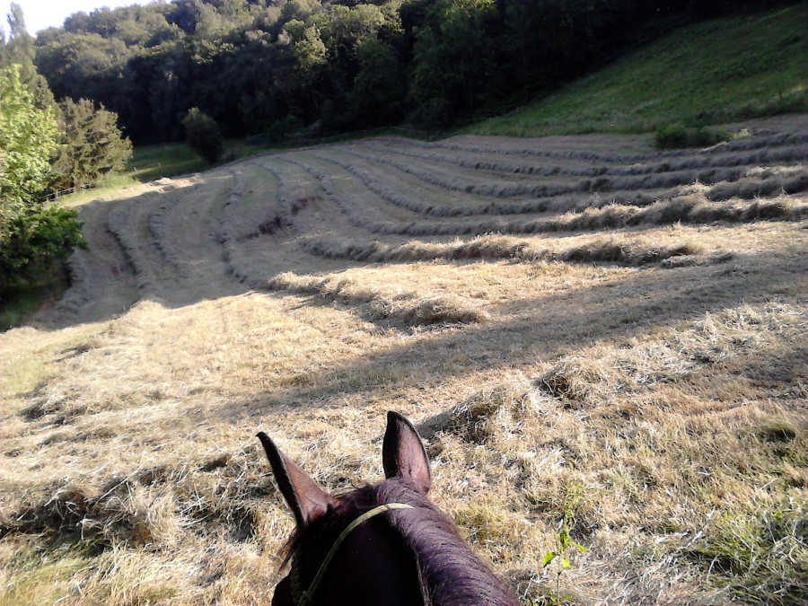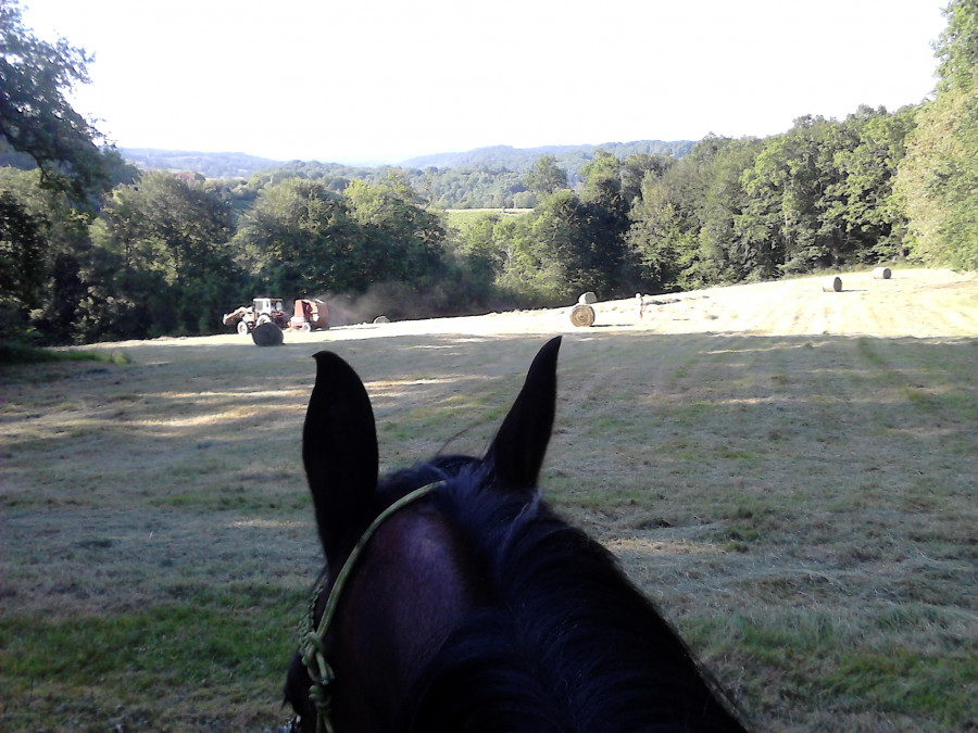 +1,3kms avec Glinski ce soir, a cru a la one again c’était pas prévu à la base. On a commencé les foins dans un pré, pendant que Gilbert andainé j’ai fait travaillé un peu Glinski en liberté dans la « carrière » puis je suis monté à cru pour aller voir les tilleuls, va falloir que je ramasse avant qu’il ne soit trop tard, j’irais demain je pense ! Puis je suis partie dans le chemin voir ou en été le voisin qui roundballait son pré et qui devait venir en suivant pour faire les boules chez moi. Puis j’ai été jusqu’à la route et je suis revenu avant d’aller d’aider pour la fin des foins.