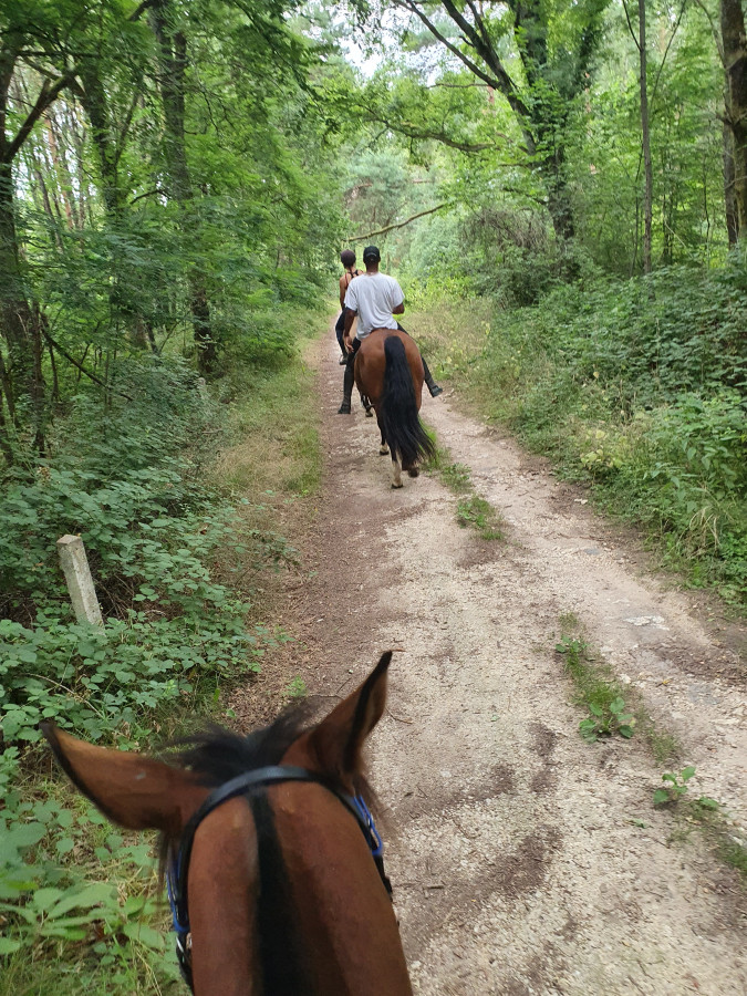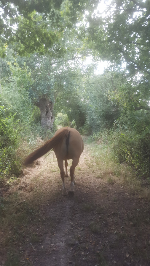 On a dû forcer le passage dans un sous-bois épineux, Lotus ne cessait de vouloir brouter, du coup il faisait n'importe quoi, a trébuché plein de fois, failli tomber dans le fossé (vous savez ces herbes, toutes à la même hauteur, alors qu'en réalité celles du bord font 5 cm et celles du milieu font 80 cm !!!) il m'a même arraché les rênes ! Et ça a fini en panpan-cucul !