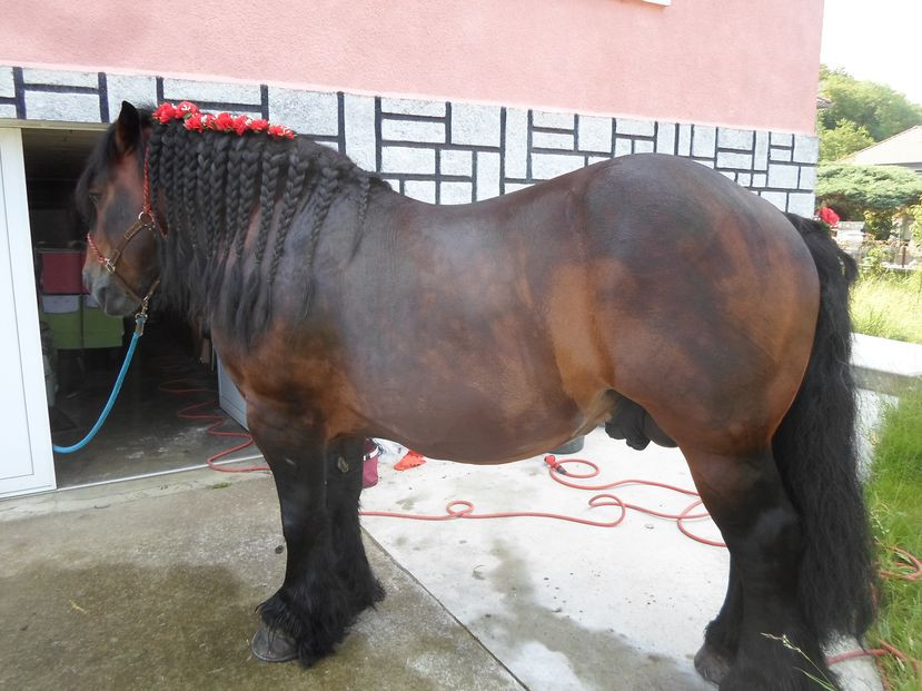 on l'a ramené à la maison, douche, brossage, lustrage, ensuite je l'ai tressé. Il a tellement de crin que j'ai eu des crampes aux doigts ! j'en voyais plus le bout de ces tresses !!!