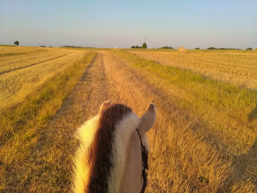 Sinon hier on a fait 5 kilomètres, petite balade de fin de journée. Avec une jument bien en forme , qui monte son dos et pousse avec les fesses des le début ! Et un bon galop qu'elle ma proposer en milieu de balade