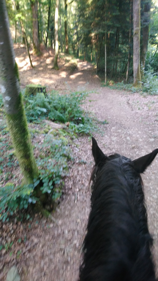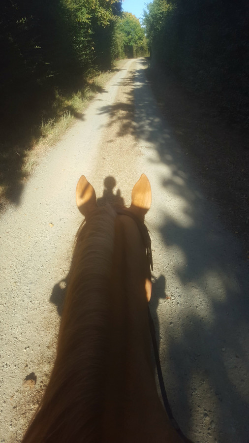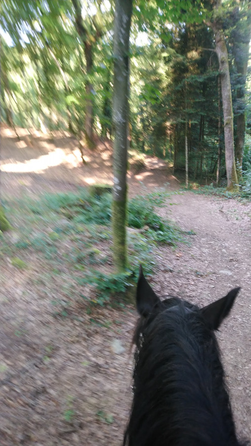+8,8km encore en solo (ça me manque les sorties à plusieurs), avec un poney mou (chaleur oblige et heure de la sieste), rênes longues du début à la fin même pour les transitions. on progresse. Malgré tout, on a quand même pu faire une petite ligne droite d'1km de galop dans les bois.