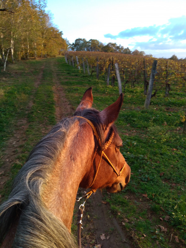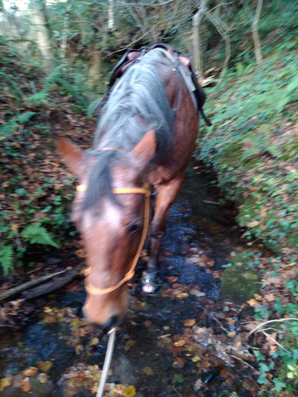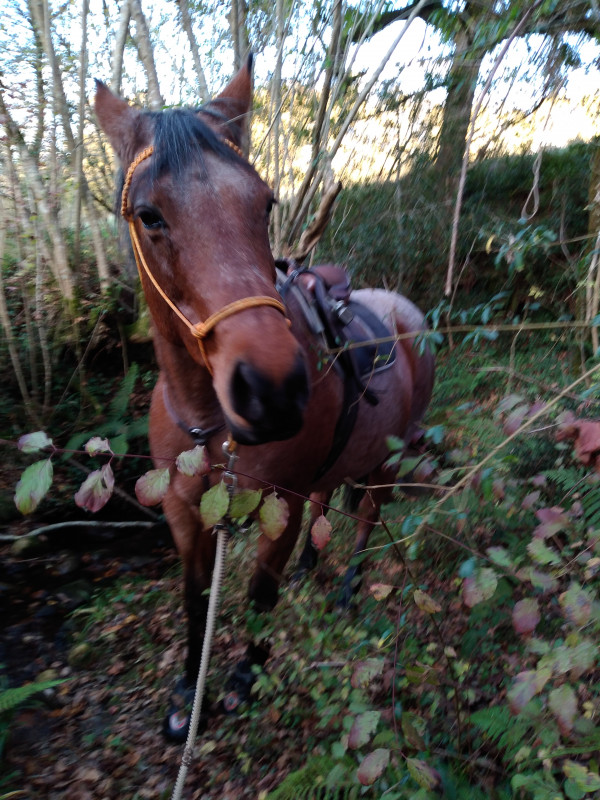 Au début je suis resté pas trop loin autour des prés, à pied et je l'ai "entraîné" à passer des embûches, enjamber un tronc : ok, passage de branches basses: ok, passage d'une descente un peu raide puis marcher dans un petit ruisseau (qui d'après elle avait une odeur bizarre, mais je n'ai rien senti) et remonter en face : heu pas évident pour la descente mais ok (fière d'elle). Puis j'ai craqué, je suis monté sur son dos et on a été un peu sur les crêtes, j'ai calculé à vol d'oiseau j'étais a 1km de l'écurie (bon a quelques centaines de mètres près... ) on a profité du soleil de fin d'après-midi, j'ai continué un peu "l'entrainement" et lui ai fait monté puis descendre une petite butte (pour faire genre contre-haut/contre-bas) on va être au top pour faire du TREC !