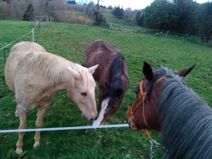 Puis au retour, au lieu de revenir par la petite route j'ai continué pour rentrer le long des prés et voir ou été les deux autres (ils étaient là ou je les avaient laissé mais un petit peu plus haut dans le pré) puis en remontant le long des clôtures ils sont venu nous voir, ils étaient mignons ! ^^