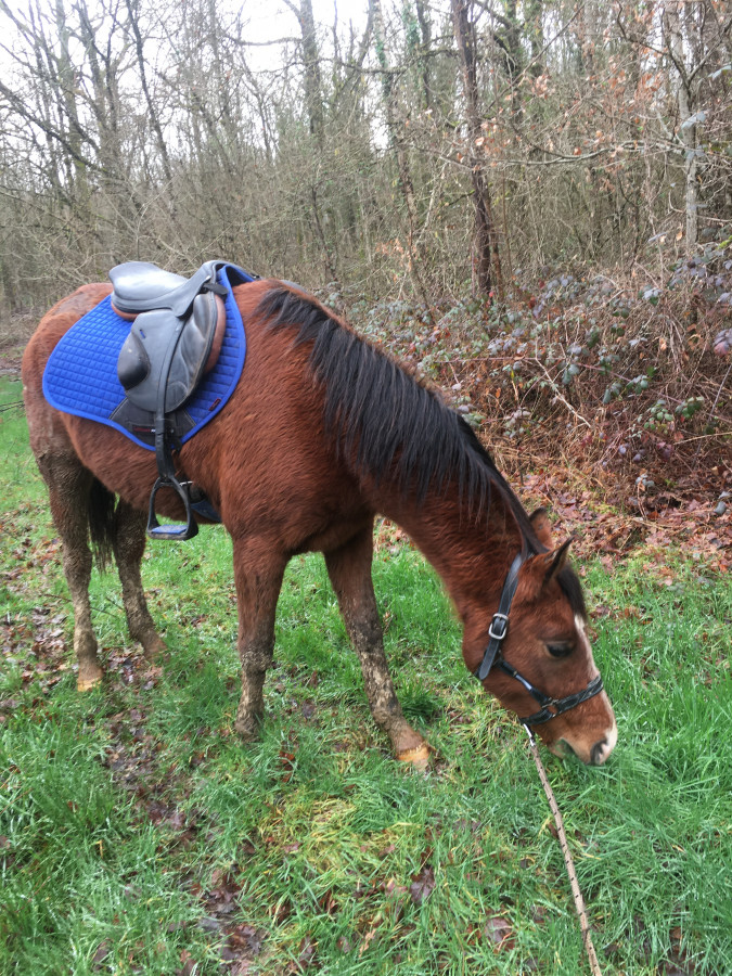 +3km. Première balade avec la selle ! Il n'a pas eu l'air perturbé, même quand on a passé le gué, enjambé un tronc, monté et descendu une butte... Seul moment où il a un peu stressé c'est quand un groupe de 6-7 chevreuils s'est mis à courir dans le pré qu'on longeait