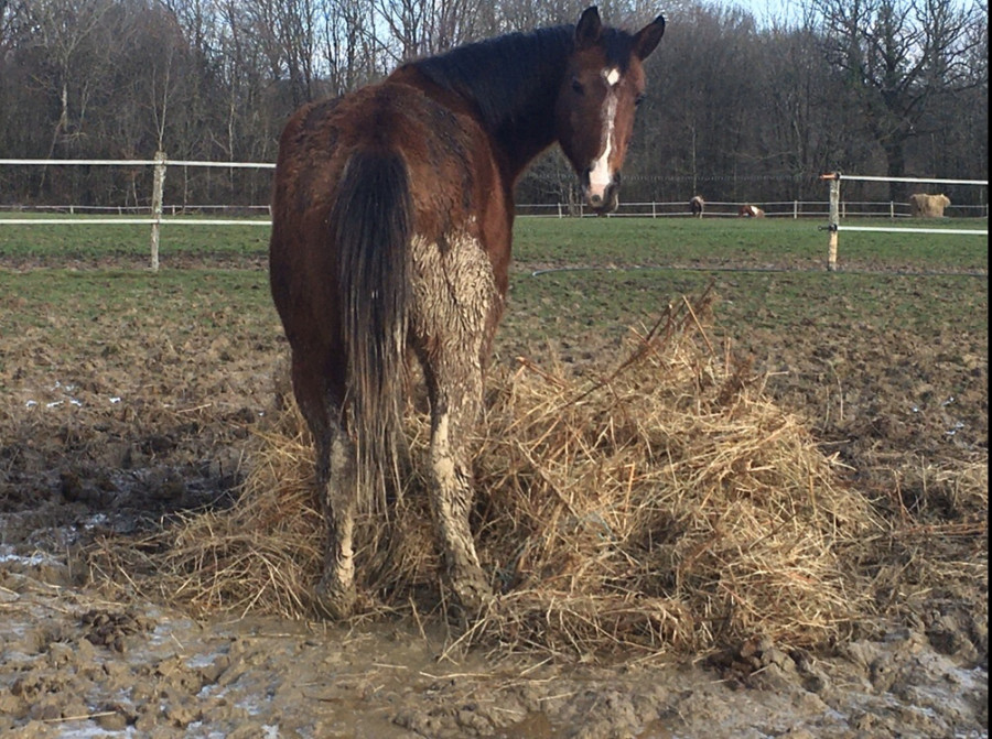 Ensuite j'ai pris mon grand en dextre, j'aurai mieux fait de le laisser aux écuries celui ci... Après m'avoir bousculé qd j'ai voulu me remettre en selle après avoir marché dans une montée pour me réchauffer, il a eu la bonne idée de se rouler dans une mare de boue, j'ai du lâcher sa longe pour éviter de finir avec lui, pas eu le temps de dire ouf qu'il était déjà couché dans l'eau glacée... Fier de sa bêtise il revient et je le rattrape sans problème, sauf que la longe est trempée et qu'il fait encore dans les 0 voir 1 degré, donc gants trempés, mains glacées, je pose la longe sur l'encolure pensant qu'il suivra gentiment comme d'hab.