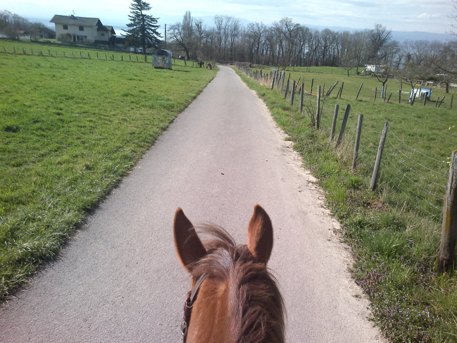 ya 4 chevaux dont 1 vieux à moitié crevé, 1 retraitée et une jument qui sort régulièrement du coup, facile de se concerter pour ne pas croiser de monde, (enfin même si on est 2 en même temps, au milieu de la cambrousse ya suffisamment de place pour rester à 10m l'une de l'autre)