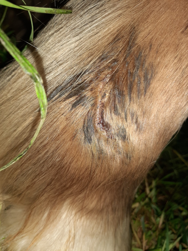 Je me demande si elle n'a pas donner un coup dans les barbelés du "voisin" comme ses chevaux étaient à côté ??? De "notre" côté c'est du fil electrique mais "chez lui" c'est des barbelés ?!