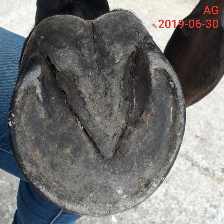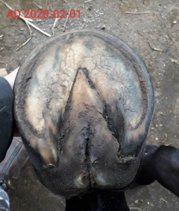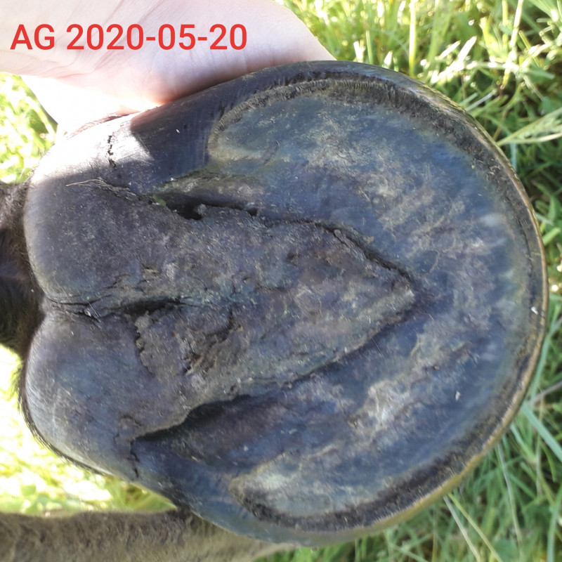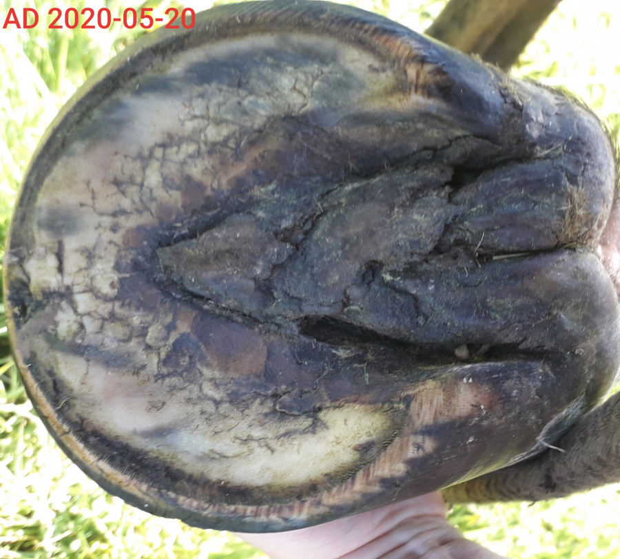 J'ai continué à pousser ma réflexion sur les conditions de vie de ma jument. Je vous mets des photos de l'évolution de l'état de ses antérieurs. Pour info, 30 juin 2019, les pieds sont quasi parfaits, 01 février 2020 après les 10 jours de box ferme d'avant Noël et au tout début de son accident de marcheur, on voit que l'antérieur droit commence à se dégrader avec une pourriture profonde de fourchette et un début de cloques sur les glômes et 20 mai 2020, après le confinement qu'elle a passé entre son box et un petit paddock. C'était même pire que ça mais au 20 mai, elle avait 10 fours de pré pour elle et ça a bien aidé les pieds à se régénérer.