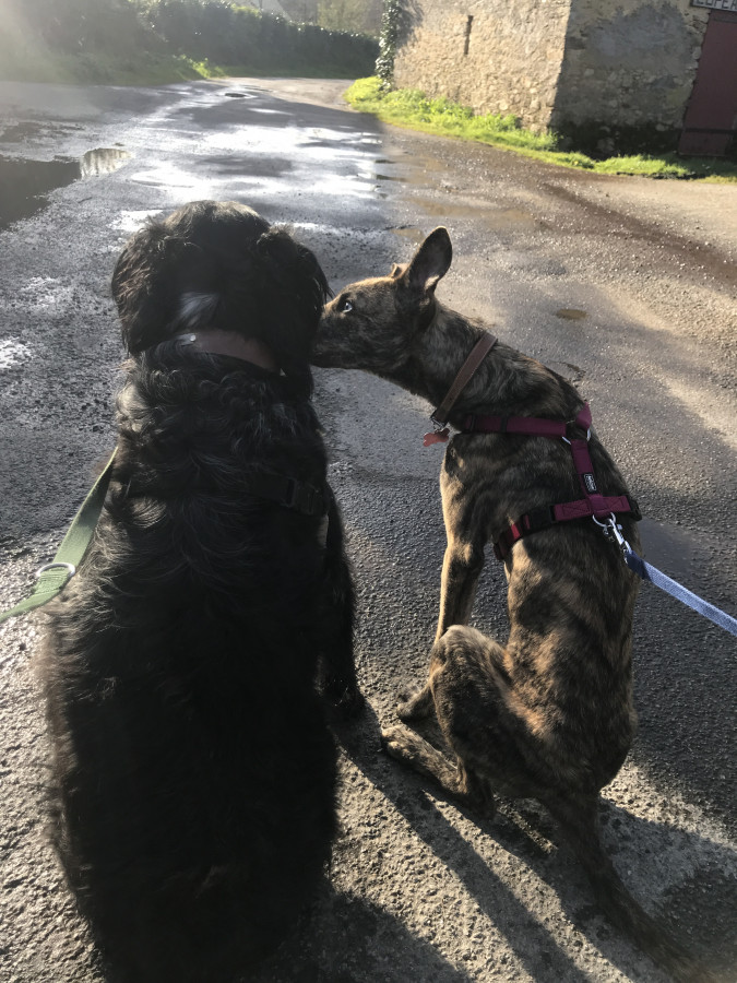 On a travailler un peu l’éducation, assis acquis, donne la patte aussi, le coucher est en cours mais c’est dur elle manque de patience !! Pas bouger est bien acquis aussi.