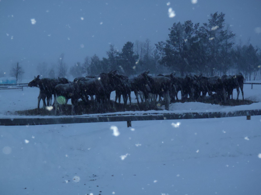 et les écuries, et les repas sont dans le bâtiment à côté. On nous préviens de suite: "when you go out , be carrefull of the moose": attention aux élans... Et des élans, on va vite voir qu'il y en a un tas: ceci n'est qu'un petit groupe: