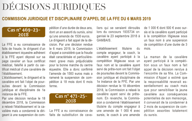 bloonda sur la question pure des sanctions/amendes possibles, la REF regorge de décisions juridiques suite à des faits de substitution de cavaliers ou d'équidés: ça va de l'amende avec sursis à la suspension de licence compet pendant un certain temps... comme dans l'exemple ci dessous
