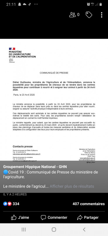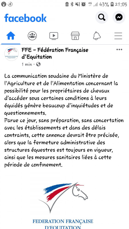 On aura le communiqué de la FFE demain matin à mon avis. Leur message posté il y a quelques minutes montre que non, on a pas y allé car les écuries sont encore fermés. Et à mon avis ils l'ont un peu mauvaises car le gouvernement a bougé un peu ses fesses.