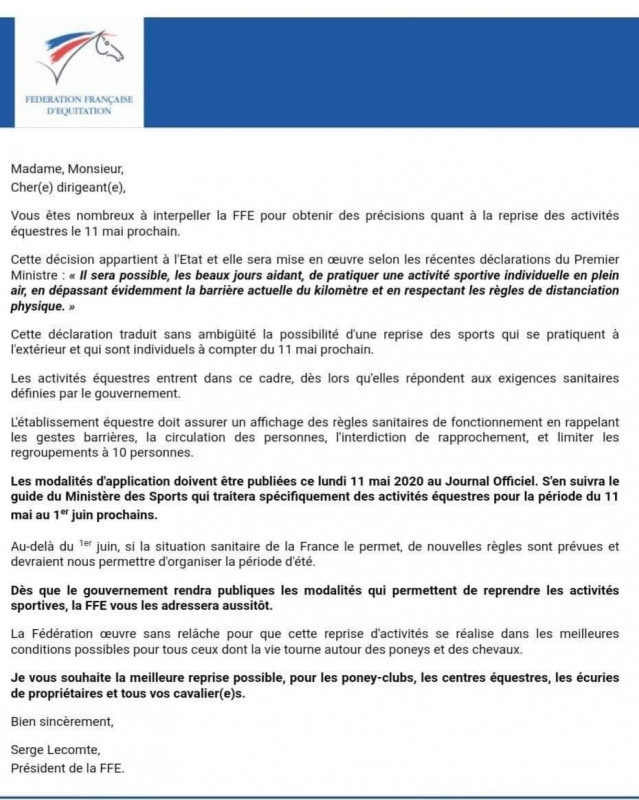 Grand Prix a publié une interview du président de la FFE, il dit que le décret officiel paraîtra lundi mais que c'est quasi sûr que les écuries ouvrent !