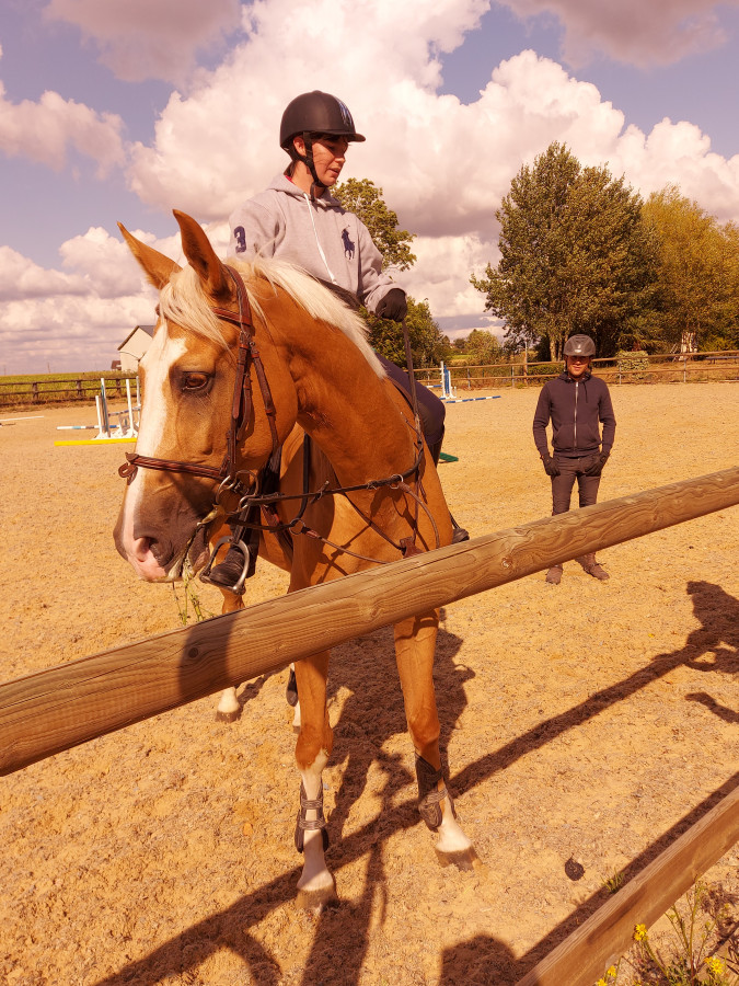 , je marche rênes longues 2 minutes, il regarde un peu partout, il est curieux, je trotte, il est un peu étroit il a besoin de reprendre du gras quand même mais il est sympa, je suis bien dessus