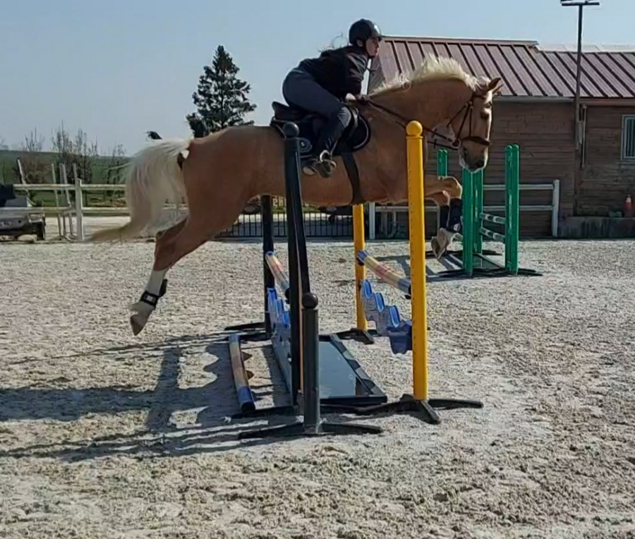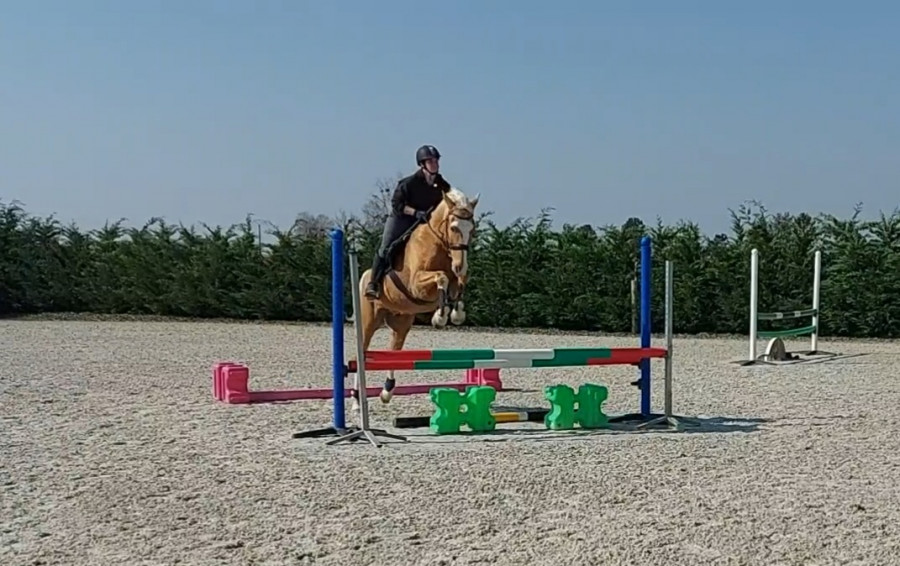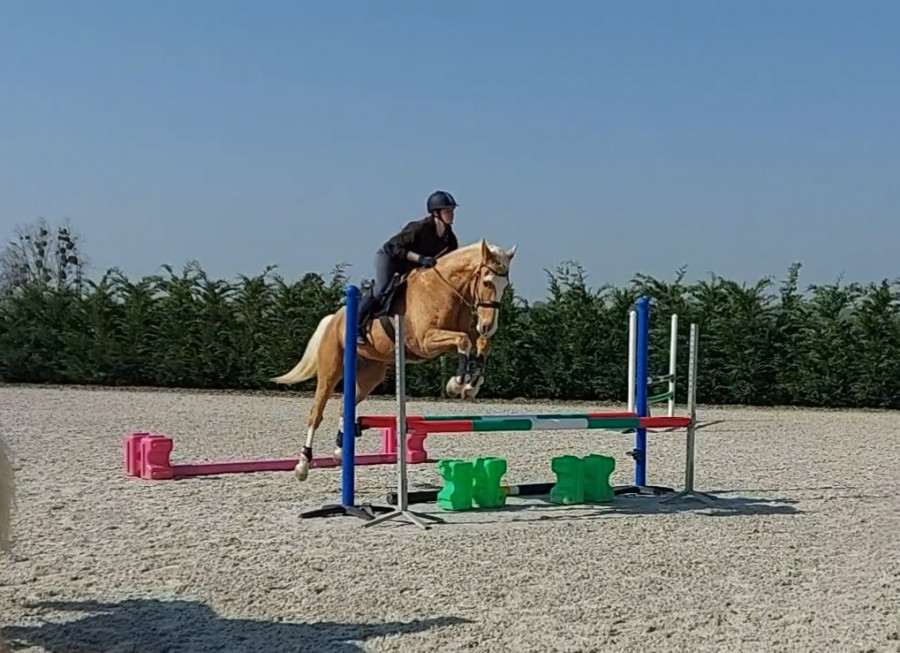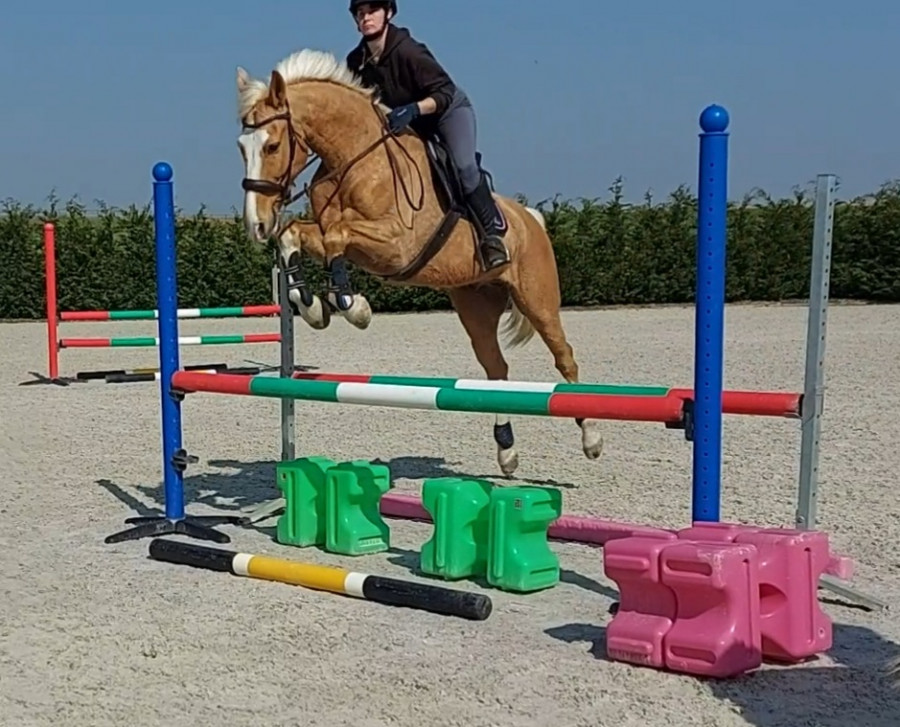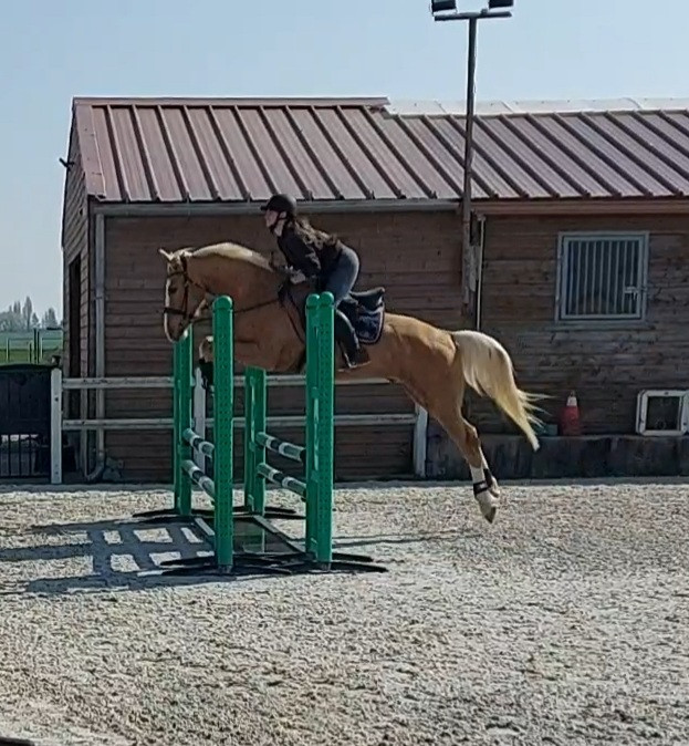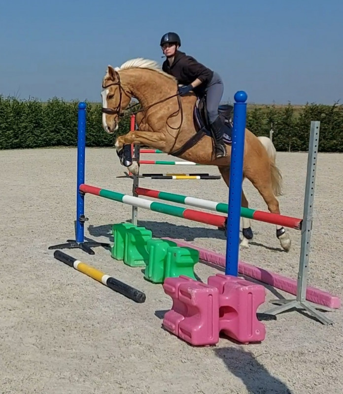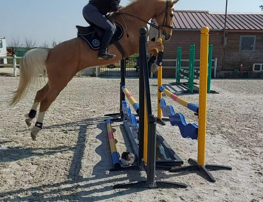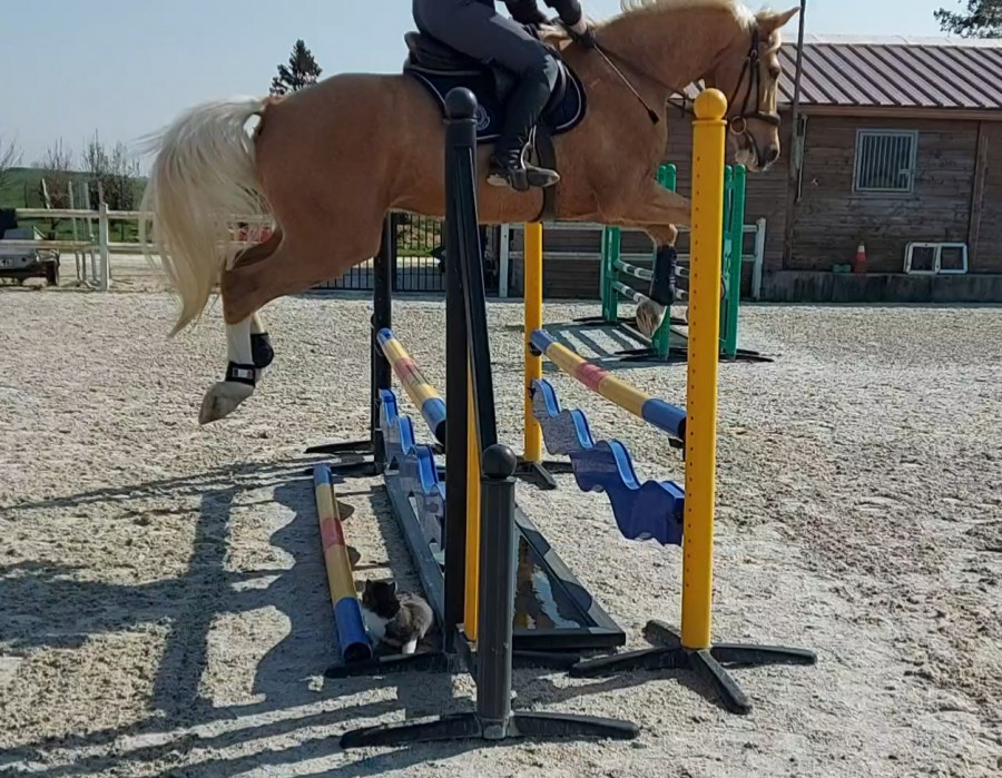 Notre boulot du moment ça va être de le déplier sur des barres au sol, qu'il développe un peu les foulées parce qu'en concours va bien falloir les sortir les foulées dans les combi. Là pour la ligne, le poney du cours est passé sans problème, c'est surtout qu'il y avait le passage dans l'eau avant, on y passe pas souvent, il a tendance à y ralentir
