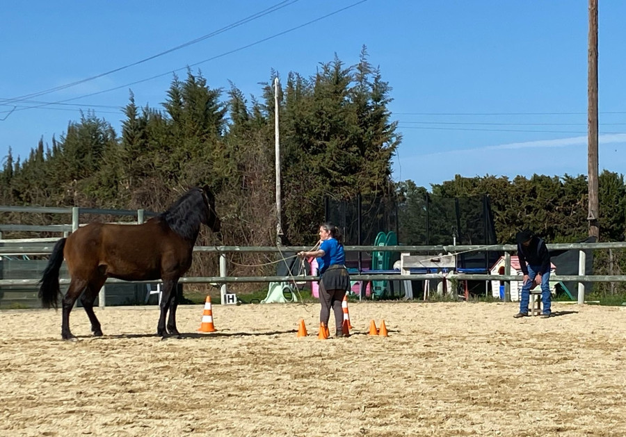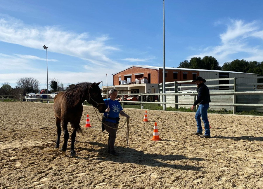 Pour finir on a travaillé la mise en avant le long de la lisse en me plaçant derrière lui, un peu comme une intro aux longues rênes, avec des demi-tours.